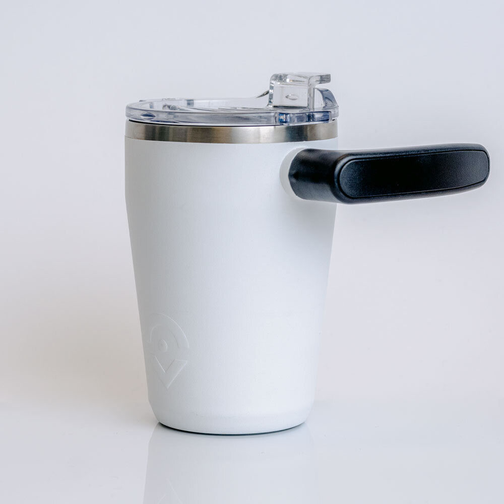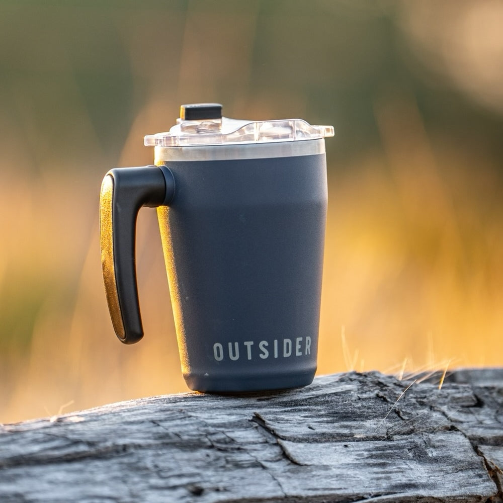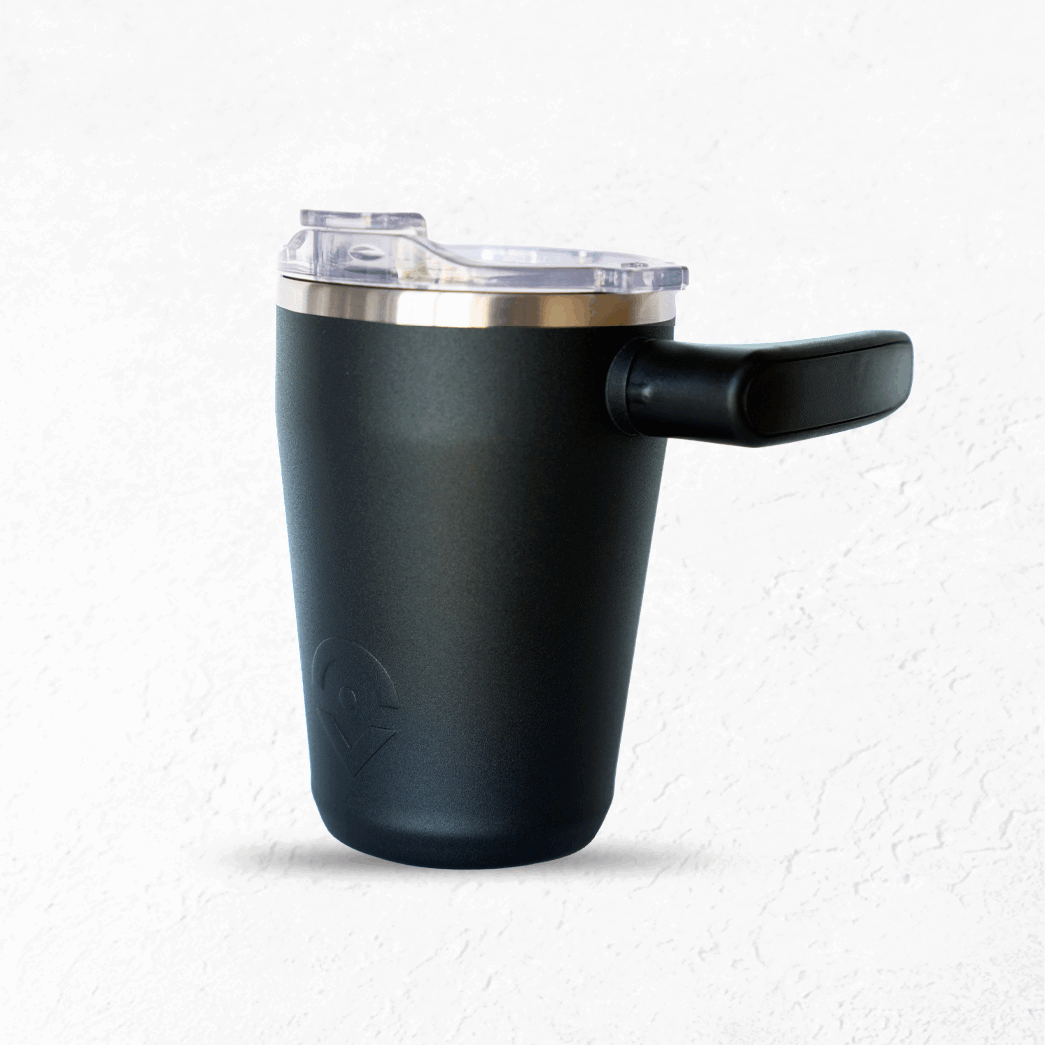 The AM mug is a rugged, stainless steel tumbler with a patent-pending swivel handle. Made to take your coffee or tea wherever you roam.
