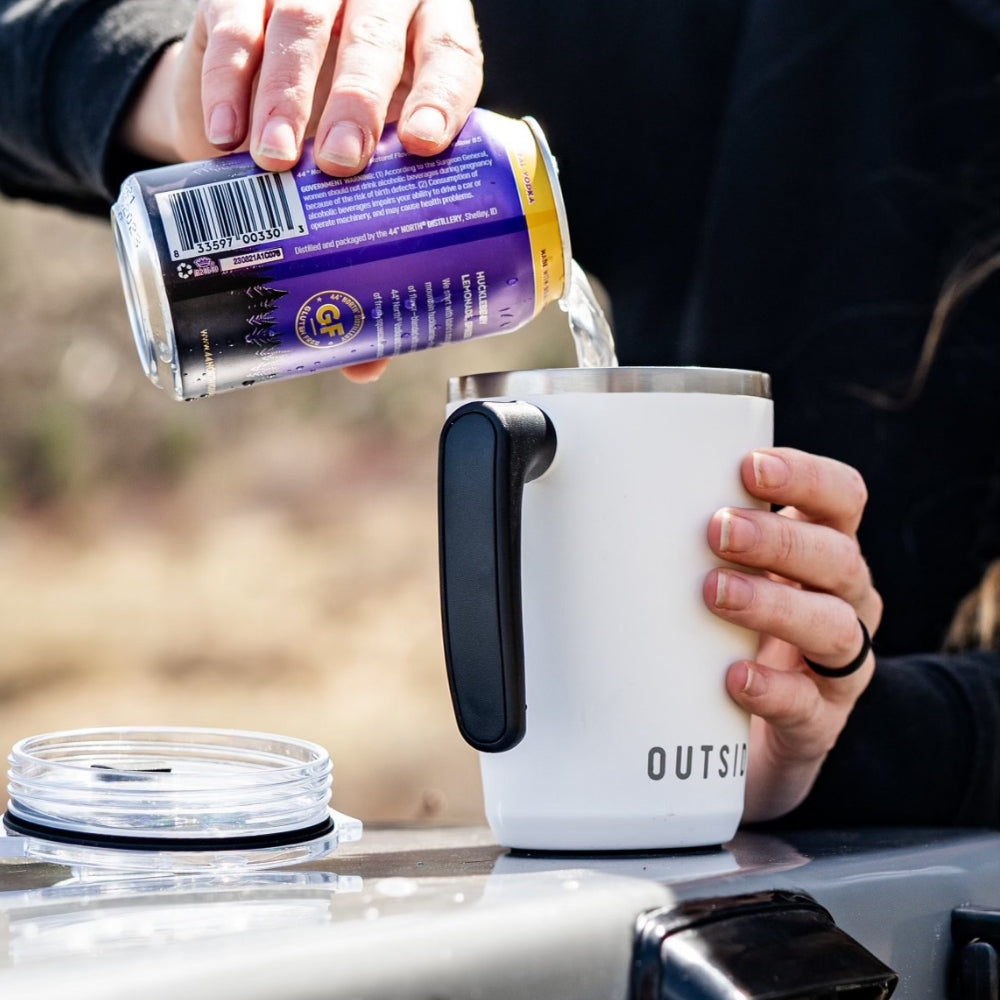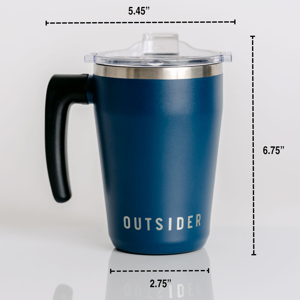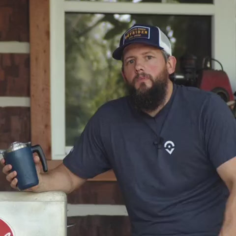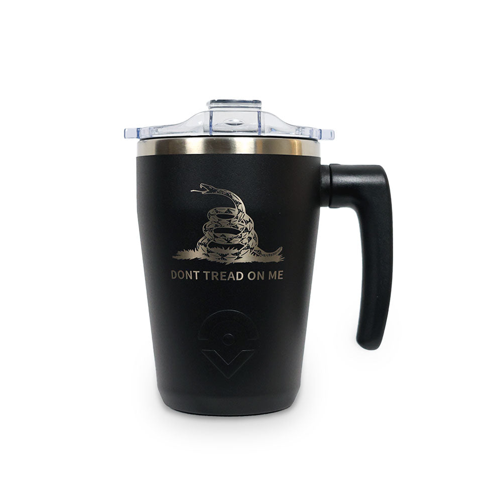The AM mug is a rugged, stainless steel tumbler with a patent-pending swivel handle. Made to take your coffee or tea wherever you roam.